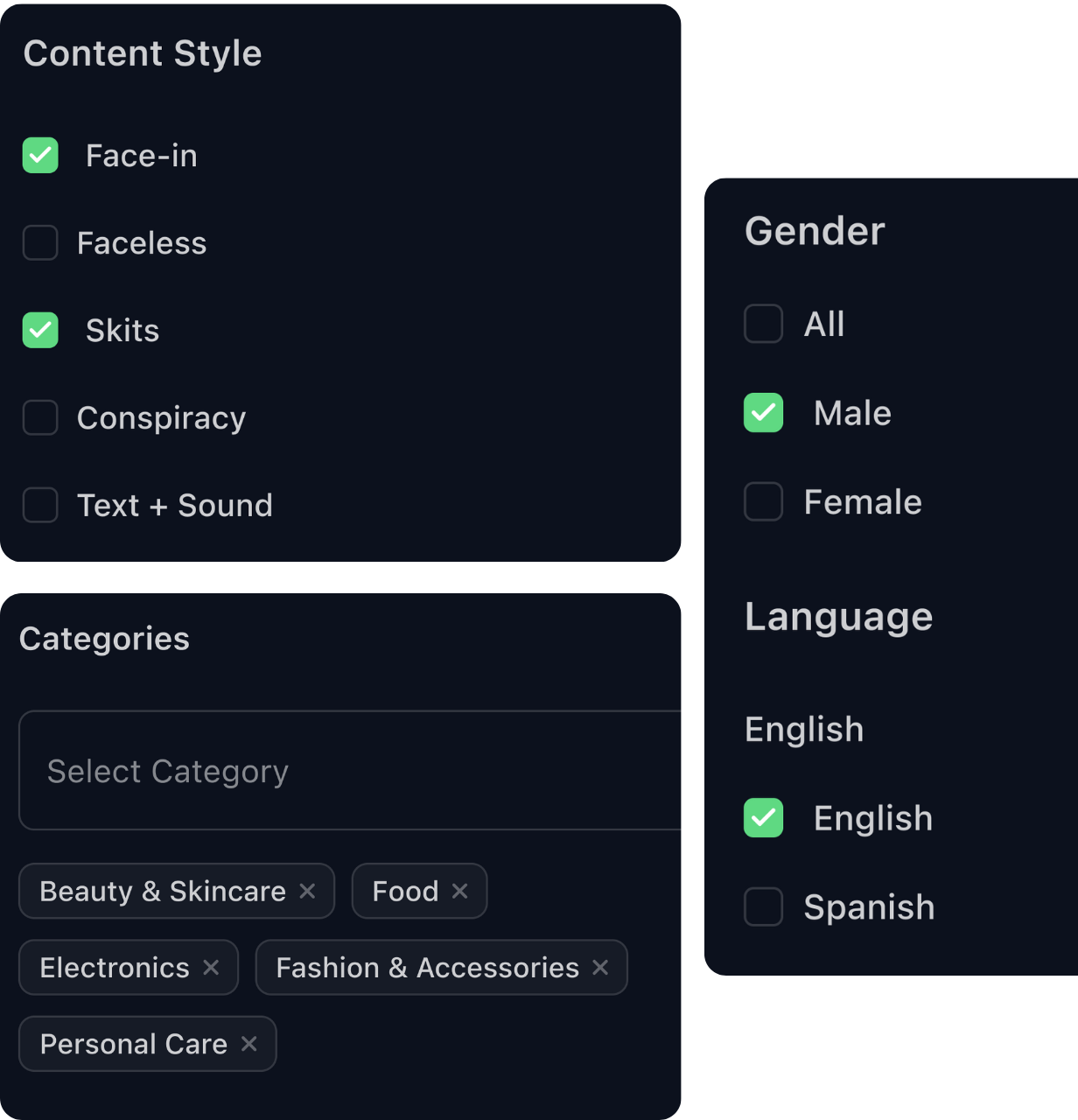 Choose from content styles like face-in, faceless, skit, text & sound, and even conspiracy — so you only see videos that match how you like to create.